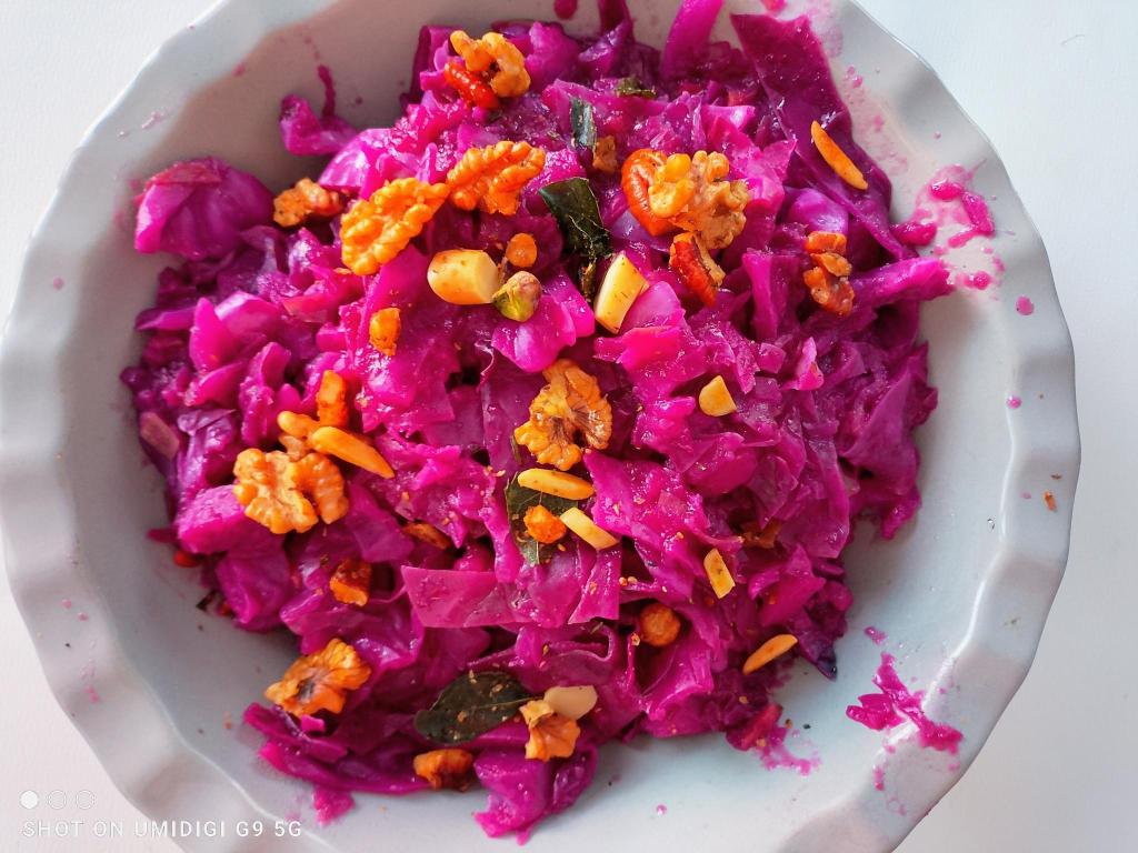 Une fusion irrésistible composée de chou rouge et de pommes de saison qui donne une saveur légèrement aigre-doux, en plus des noix qui ajoutent du croquant. J’aime beaucoup déguster ce plat super léger a avec un wrap et une sauce fromage ou un pesto au basilic.