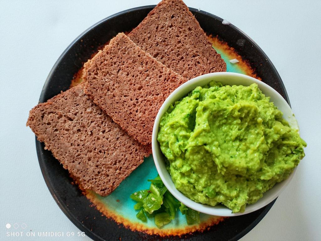 Pouvoir échanger les avocats contre les petits pois et le brocoli permet de créer un sauce trempette qui est à la fois plus légère tout en contenant moins de calories que dans la guacamole traditionnelle – d’être à la fois très verte et délicieuse! Idéale lorsqu’elle est accompagnée avec des tranches de pain de seigle ou au levain (comme sur la photo), ou encore, des craquelins à base de grains à blé entier, du pain aux pois chiches et boulgour.