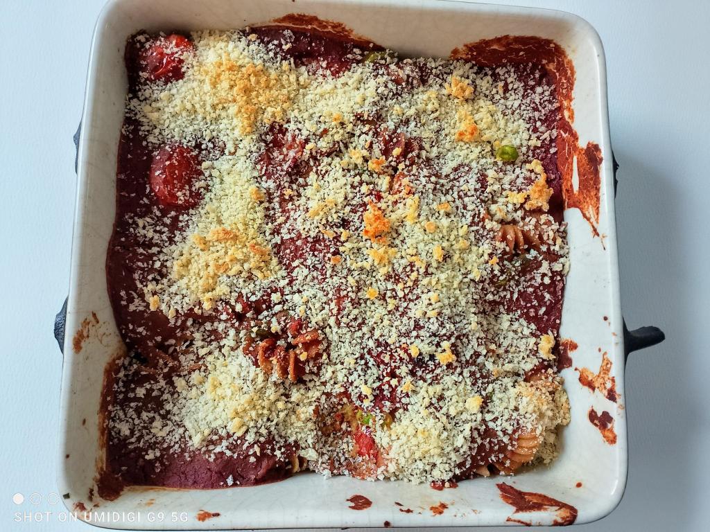 - Ajouter la sauce aux macaroni cuits avec les fèves de soja dans la casserole. Y ajouter les tomates cerises, puis répandre le mélange de légumes uniformément. Saupoudrer de chapelure à blé entier et ajouter 1/4 de cuillerée à café de paprika. Cuire jusqu’à ce qu’à ce qu’il devienne doré, soit environ 20 minutes. Servir chaud.