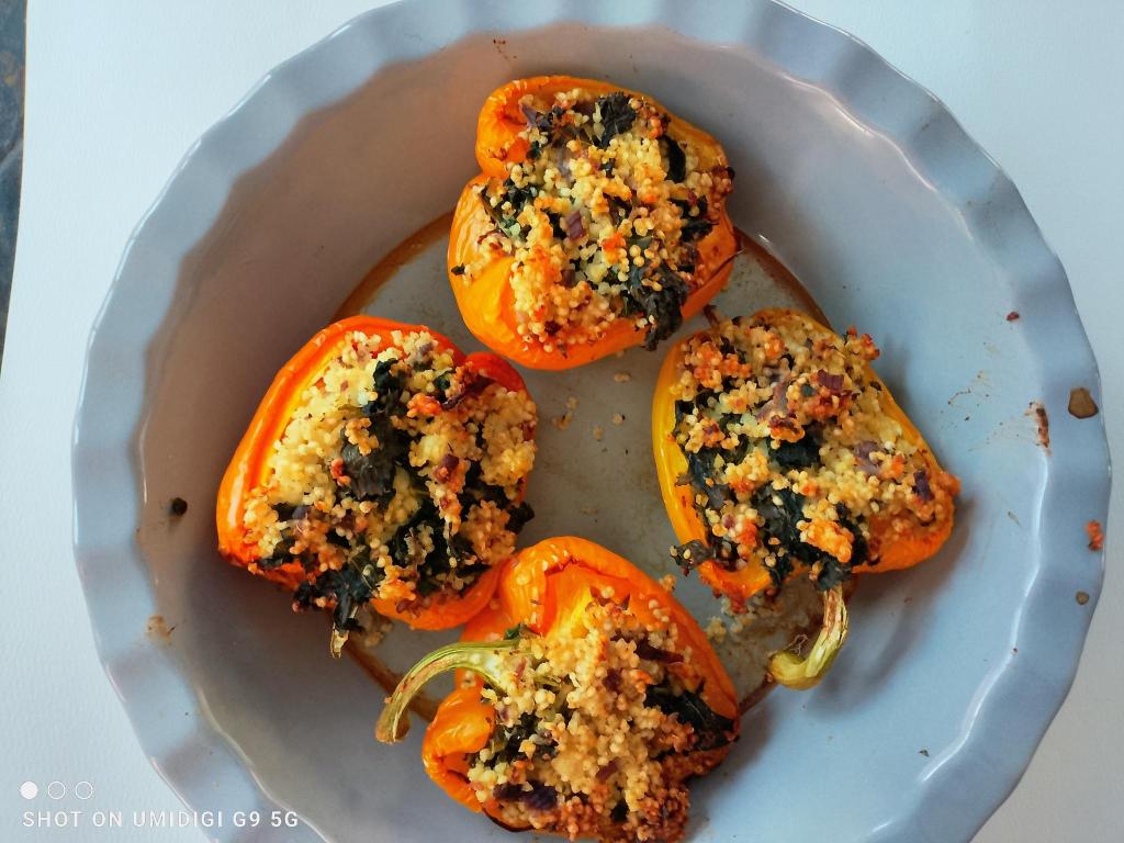 - Farcir les poivrons du mélange avec le millet, puis les aligner sur une casserole de cuisson au four. Ajouter 1/2 tasse (120 ml) d’eau dans la casserole, couvrir hermétiquement, puis cuire les poivrons jusqu’à ce qu’Ils soient tendres et la farce chaude. Servir chaud, deux poivrons par convive.