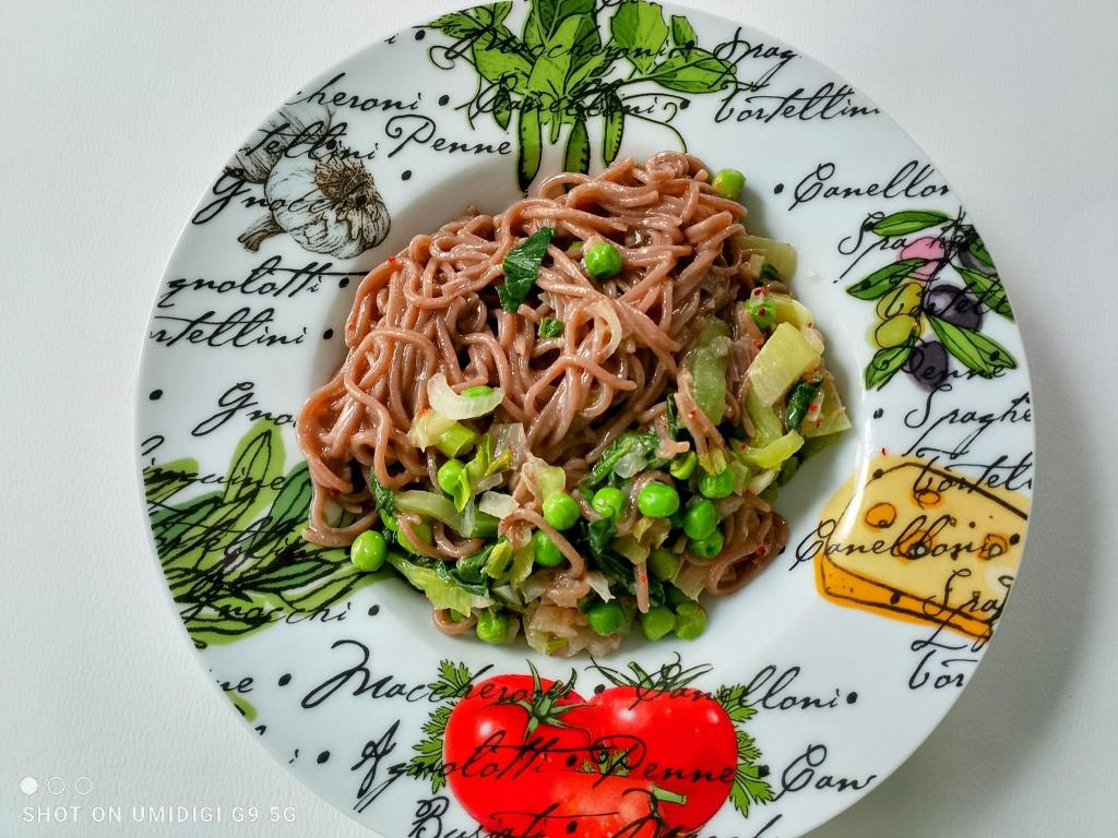 Les nouilles de sarrasin, appelées soba, sont commercialisés dans des marchés asiatiques tel que le marché Newon dans la section des nouilles soba coréennes fraîches congelées (seoultrading.ca) et qui sont d’une saveur élégiaque, et ainsi que dans d’autres supermarchés. Il ne faut être créatif si l’envie vous prend, et choisir selon vos goûts, des légumes à sauter, ainsi que ceux qui attendent fébrilement dans le bac à légumes.