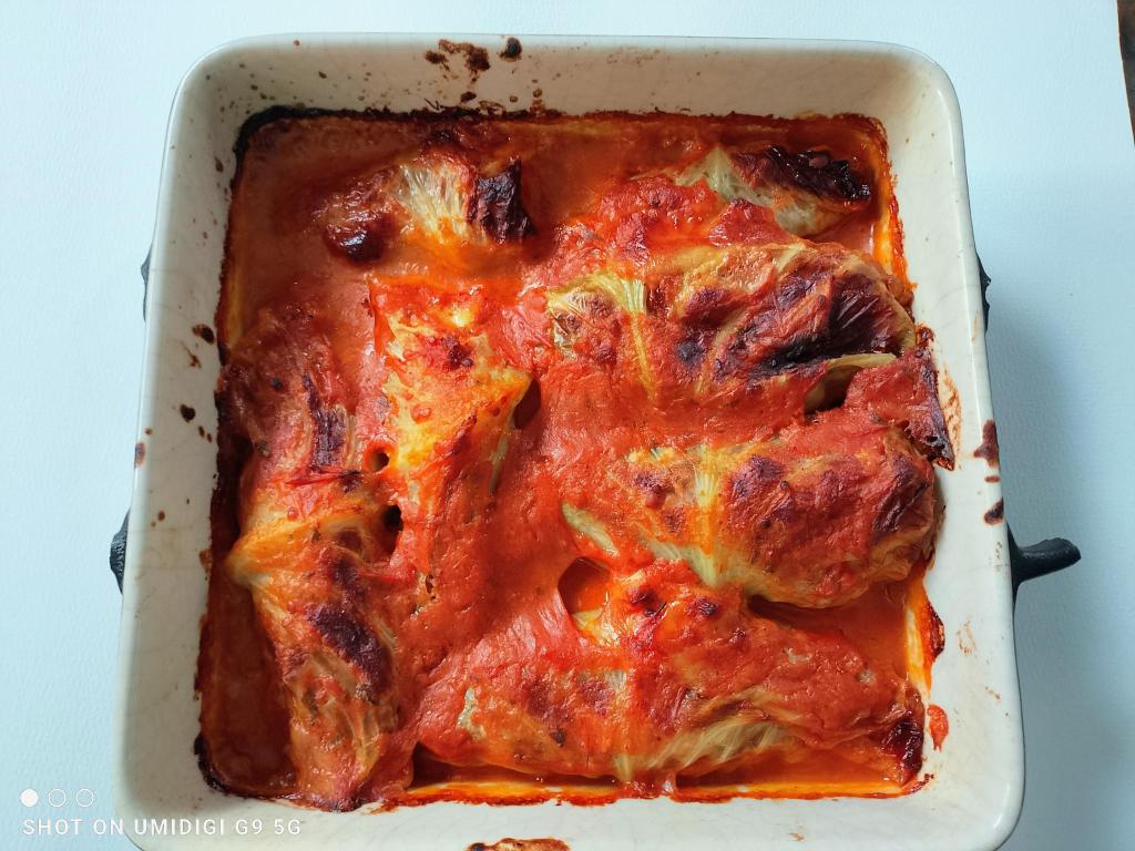 - Dans un bol, combiner la sauce tomate avec le vinaigre balsamique, le sirop de dattes et la poudre d’oignon. Bien mélanger. Dans un plat de cuisson de 23 x 33 cm (9 x 13 pouces), verser la moitié de la sauce tomate. Disposer les rouleaux de choux farcis, la nervure reposant vers le bas. Y verser le reste de la sauce tomate. Couvrir hermétiquement puis cuire le chou jusqu’à ce qu’il devienne tendre, soit environ 45 minutes. Servir chaud.