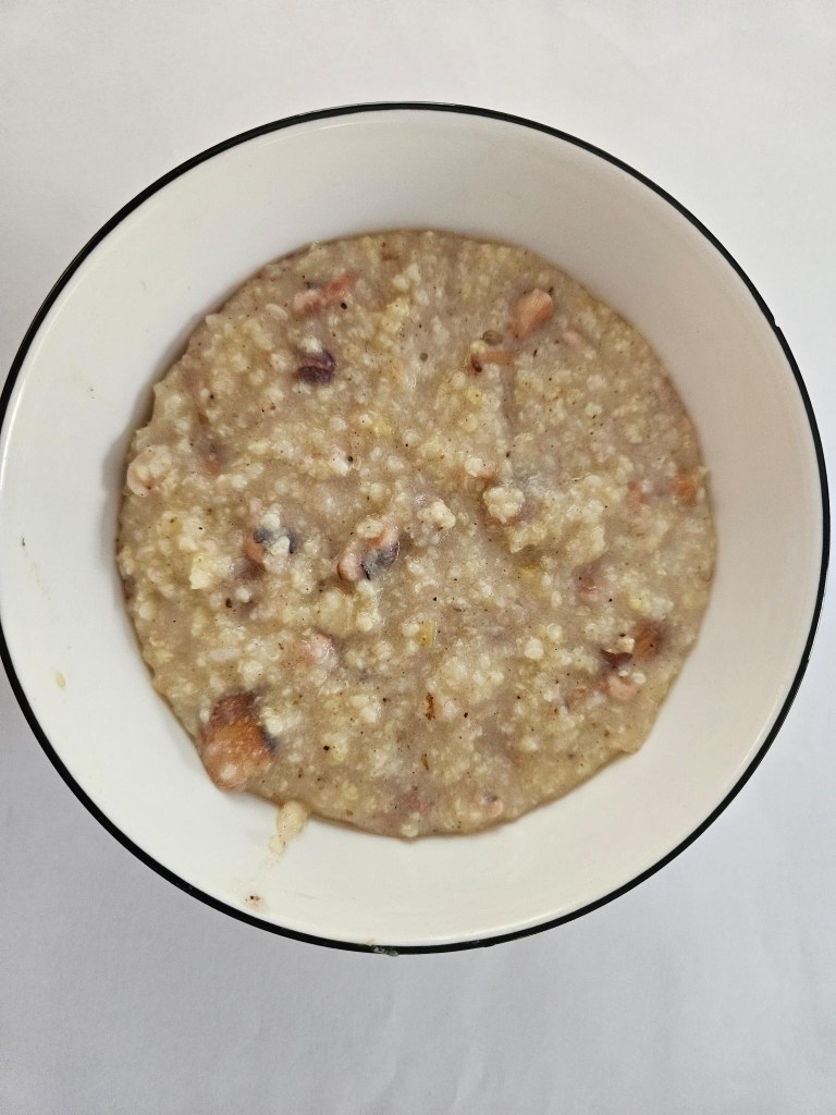 - Dans une grande casserole, y ajouter les graines de lotus et les noix de renard , le millet queue de renard, le bouillon ou le lait , le gingembre, la muscade, le yam chinois (si utilisé). Porter à ébullition puis réduire le feu à minimum. Couvrir et laisser mijoter pendant 30 minutes, tout en brassant de temps à autres afin que le porridge ne colle pas. Le porridge est cuit lorsque le millet est devenu complètement moelleux.