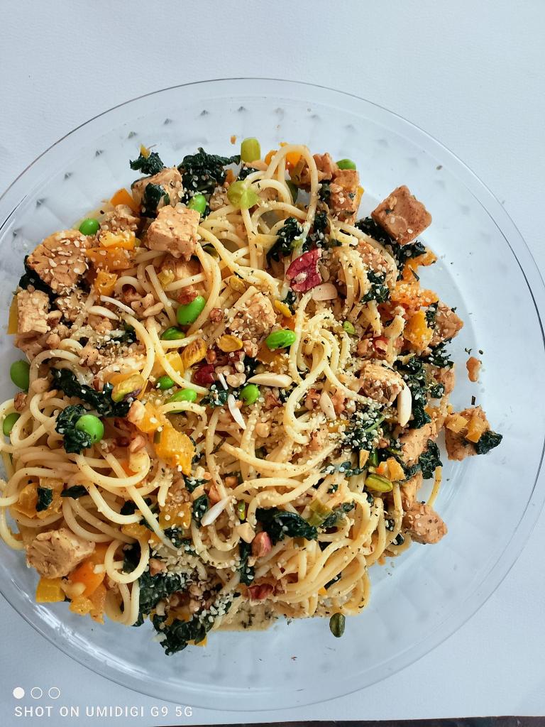 - Ajouter le mélange de tempeh et de légumes, puis bien mélanger. Servir avec les noix et le cilantro.