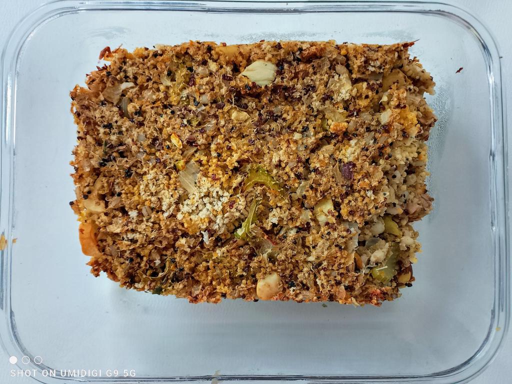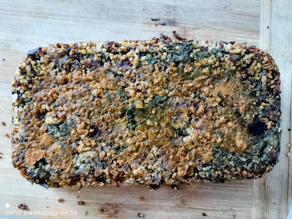 - Pré-chauffer le four à 350°F (175°C). Dans un grand bol, combiner les noix, les graines de lin, la levure alimentaire, cilantro, le mélange d’épices savoureux 2.0, le thym, le sauge, le pippali, le sel (si utilisé). Y ajouter le mélange céréales et de légumes en attente. Ajouter la chapelure, puis bien mélanger. Si le mélange est trop liquide ajouter plus de chapelure, en petite quantité à la fois, jusqu’à ce que le tout soit bien intégré pour former une miche de pain.