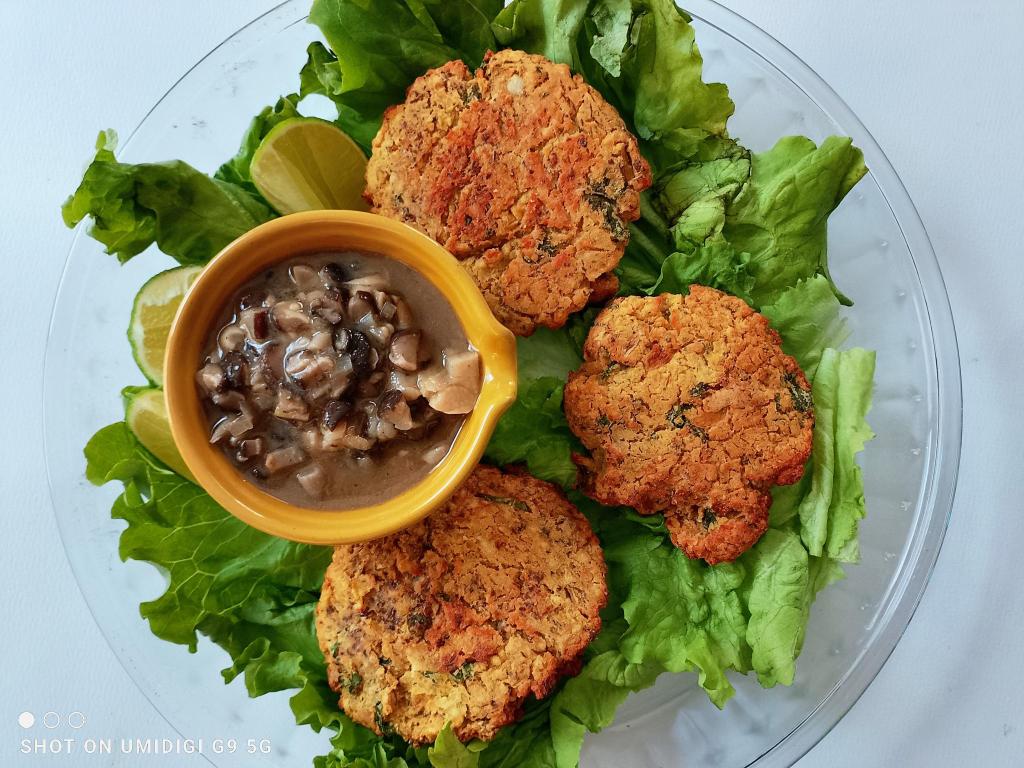 Ces plus que délicieuses galettes peuvent avantageusement servies avec la sauce aux champignons (voir un peu plus bas) ou avec des condiments que l’on préfère. Pourquoi pas les incorporer dans un wrap avec sa sauce préférée ou une sauce tomate.