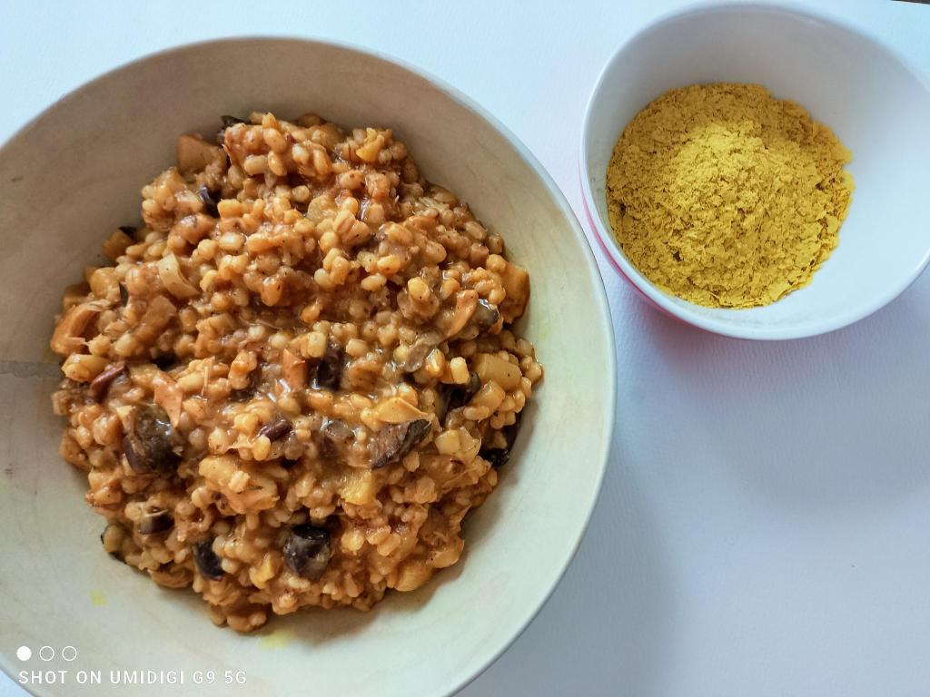L’orge perlé constitue une excellente alternative afin de remplacer le riz arborio traditionnel, produisant ainsi un risotto à la fois dense et crémeux. La présence des champignons et des coeurs d’artichauts procure une texture et une saveur qui qui ajoute un contraste avec le grain entier. On peut cuire à l’avance l’orge dans un autocuiseur à pression pendant environ 22 minutes dans 2 1/2 tasses d’eau filtrée.