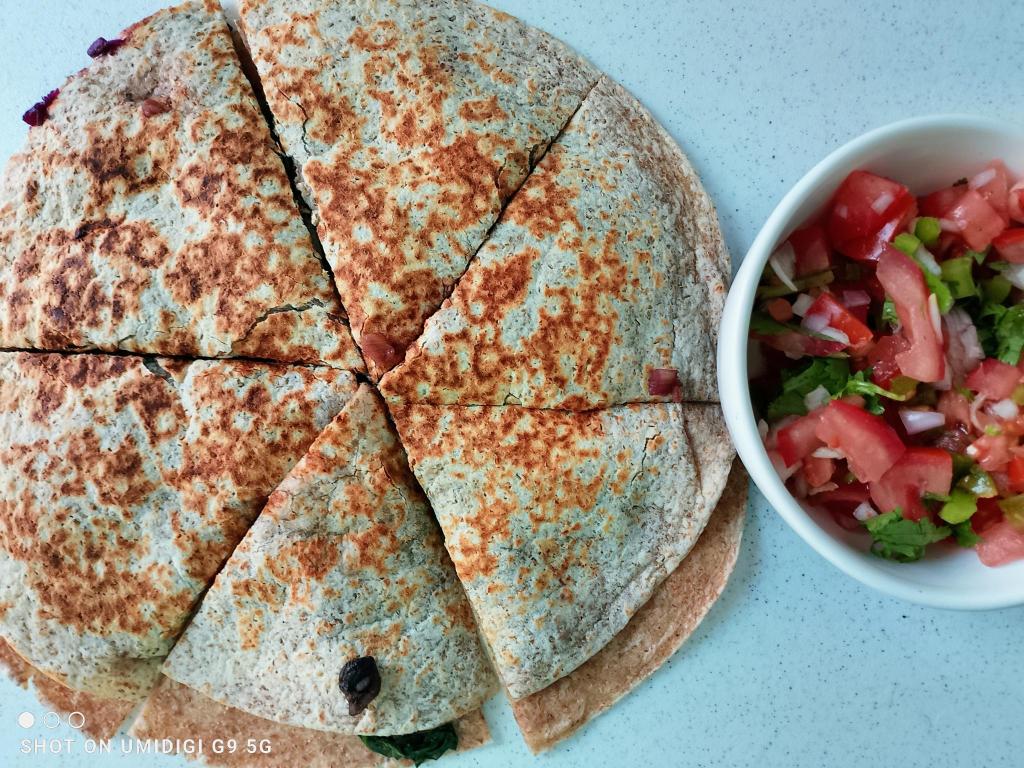 - Pour servir, couper chaque quesadilla en pointes multiples (4 ou 5), puis les disposer sur une grande assiette. Servir telle qu’elle ou l’accompagner d’une sauce tomatillos vertes ou tomates rouges maison de son choix.