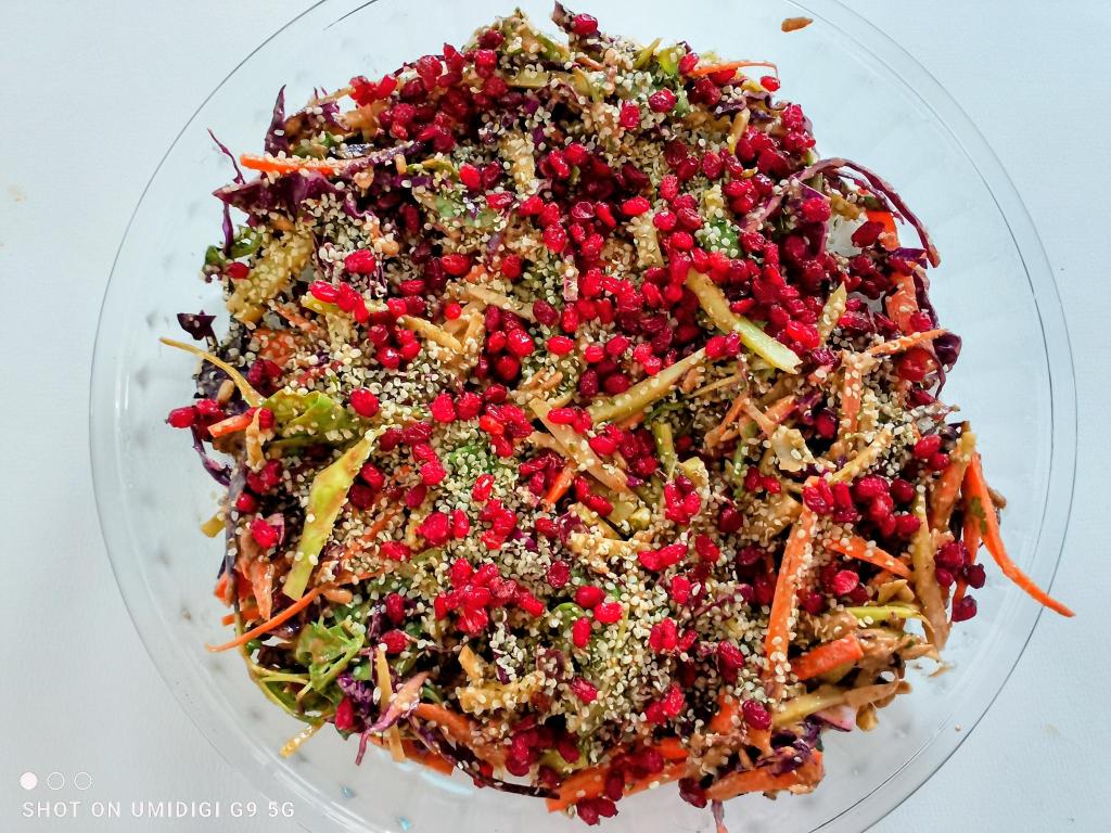 Un délice digne d’un festival, cette salade fait ressortir à la fois une grande quantité de couleurs, de textures et de saveurs qui procurent une joie visuelle et gustative sans pareil. On peut remplacer l’épine vinette par des baies de goji, y ajouter des dattes fraîches dénoyautées ainsi que des myrtilles congelées.