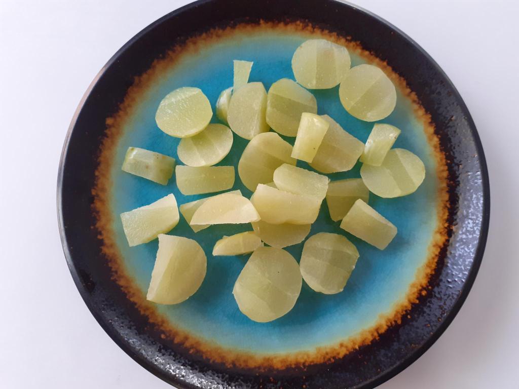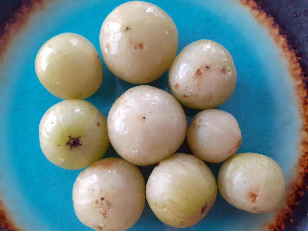 - Préparer les baies d’Amla. Rincer les baies dans de l’eau filtrée puis les ajouter dans un bol contenant de l’eau salée. Faire tremper pendant environ 5 minutes puis les retirer et les frotter avec une brosse à légumes pour retirer toute impureté. Couper chacune des baies en 3 parties distinctes puis débarrasser de la pierre/graine.