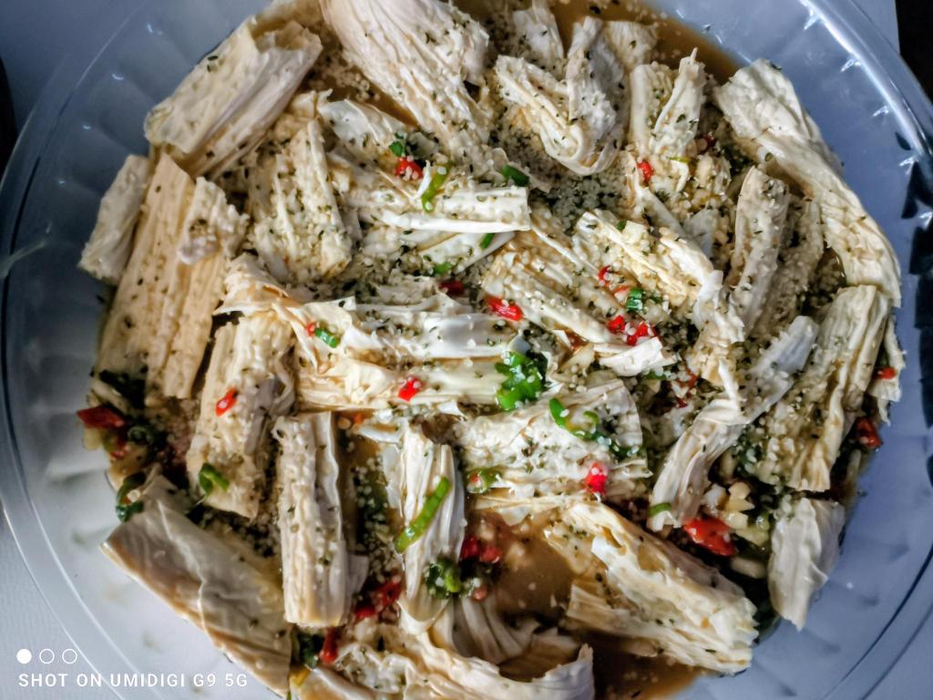 - Faire tremper la peau de tofu afin de la ramollir dans l’eau bouillante pendant 15 minutes. Enlever les parties dures enlevées et s’en départir.
