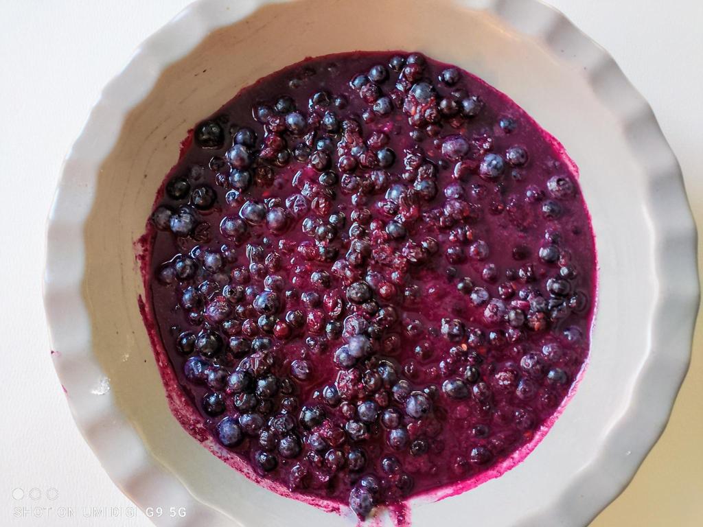- Y ajouter les graines de chia, le jus de lime, et le reste des bleuets. Laisser refroidir légèrement, puis répandre uniformément la farce sur la croûte préparée. Réfrigérer pendant au moins 4 heures afin de permettre à la farce de bien s’intégrer.